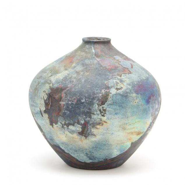 Hand-thrown raku ovoid vase, incised signature to the bottom.