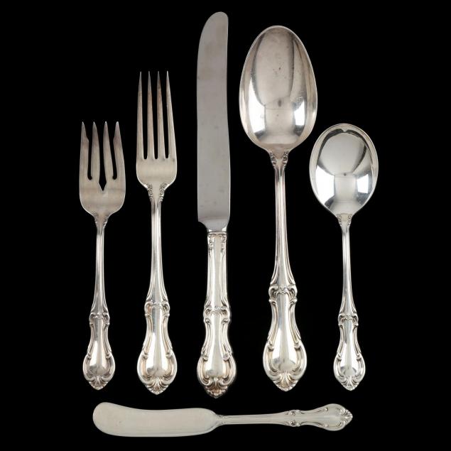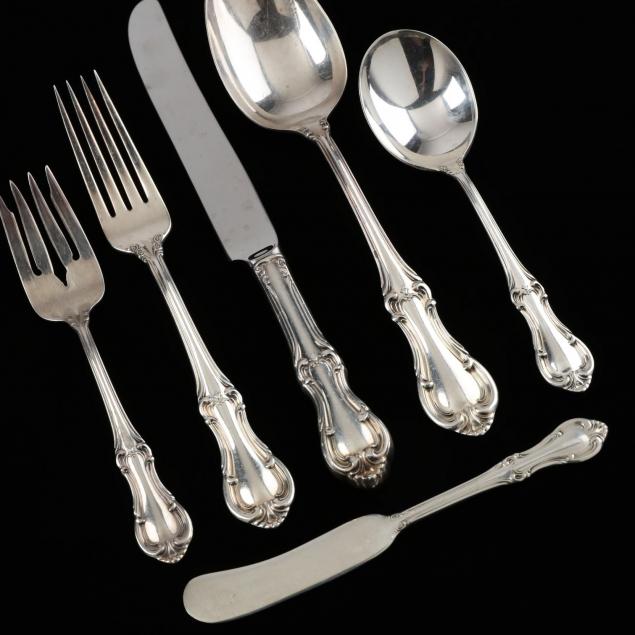 Including: (10) knives (9 in.); (8) forks; (7) salad forks; (8) seafood / cocktail forks; (10) butter spreaders; (12) demitasse spoons; (5) iced tea spoons; teaspoon; round soup spoon; (3) tablespoons; tomato server; cream ladle; gravy ladle; bon bon scoop; sugar spoon; jelly server; and master butter knife. No monograms.