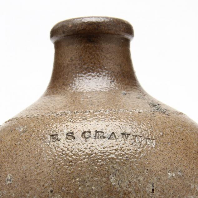 Salt glazed stoneware one-half gallon jug features a line of coggle wheel decoration at the upper shoulder, some light orange peel, impressed stamp below the line of decoration "E.S. CRAVEN ".