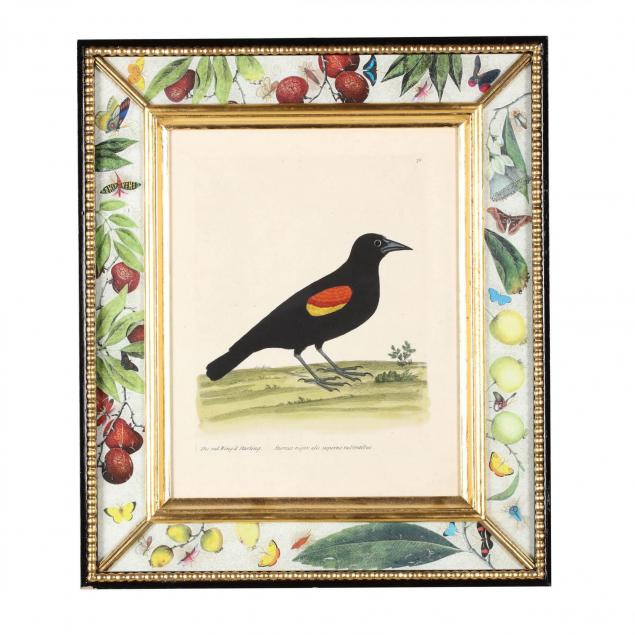Engravings with hand-color on laid paper, 18th century, to include "The Stone Curlew," "The Red-Wing'd Sterling," "The Grey Plover," "The Ring Ouzell," "The Jacobine Pidgeon," "The Bee-eater," "Land Rail," "The Quail from the Cape of Good Hope," "The Green Plover," "The New England Partridge," "Quail," and "The Ruff," presented in matching custom gilt and painted frames with applied botanical decoration.