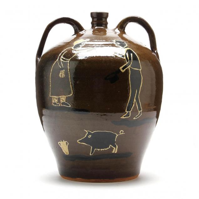 1990s, Edgefield style, five gallon size, slip decorated with an African American couple and a pig, not signed.