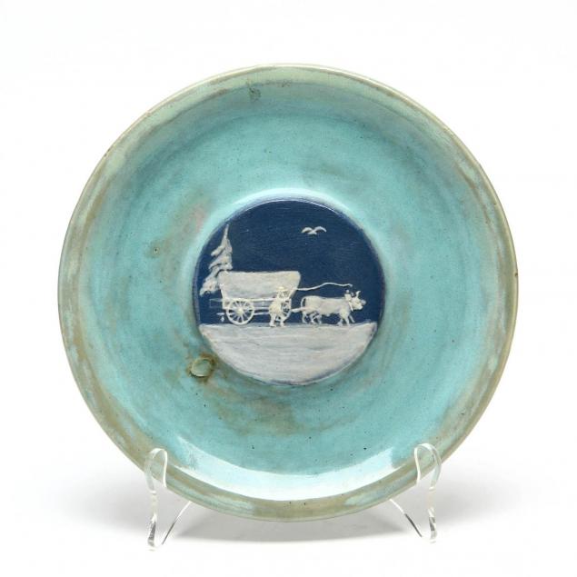 A turquoise glazed plate centered with a cameo covered wagon, hand inscribed on the back of the plate "Pisgah Forest Pottery West Asheville NC 1931"