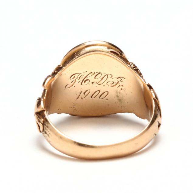 Central oval tablet engraved with cross to center surrounded by bird, scroll and tree motifs flanked by two dragon heads to band, interior engraved F.C.D. Jr. 1900, unmarked and testing 14KT.