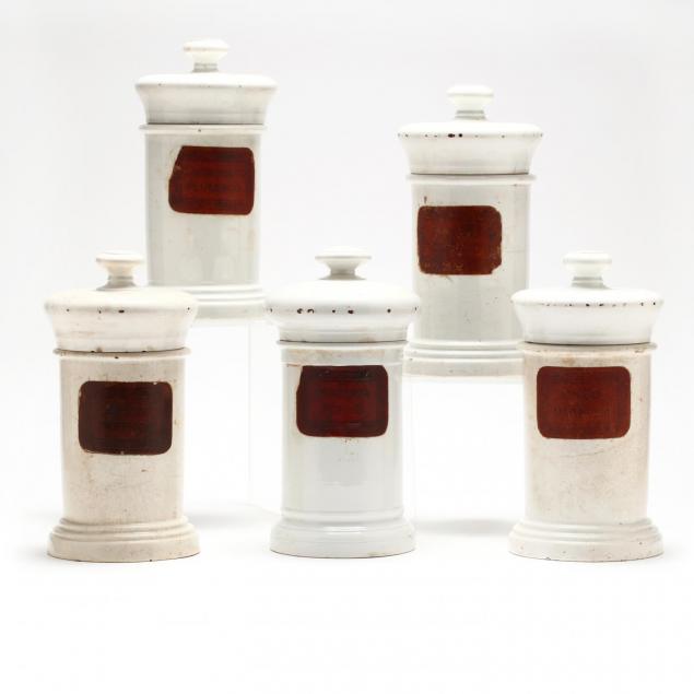 Second half 19th century, white porcelain with stepped bases, domed lids with knobs, applied russet leather labels, four with underglaze bottom stamp.