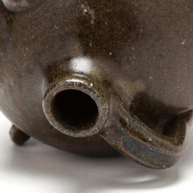 This dark olive colored alkaline glazed face jug features a broad nose, open mouth with full lips and six clay teeth, unglazed eyes, signed on the bottom in script.