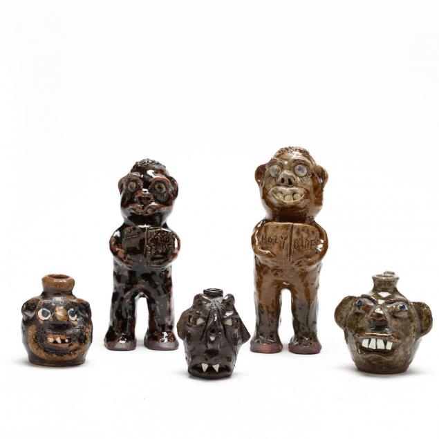 Group of five molded pottery pieces, to include three miniature face jugs, one of the three a horned devil with fangs; two preacher figures each, all signed.