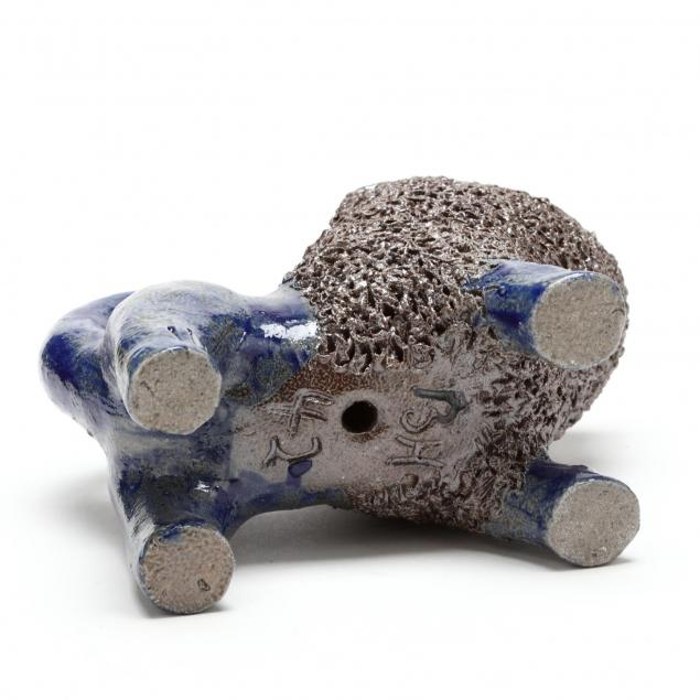 Shenandoah lion with curly clay mane and cobalt glaze, signed on the bottom "BH 42".