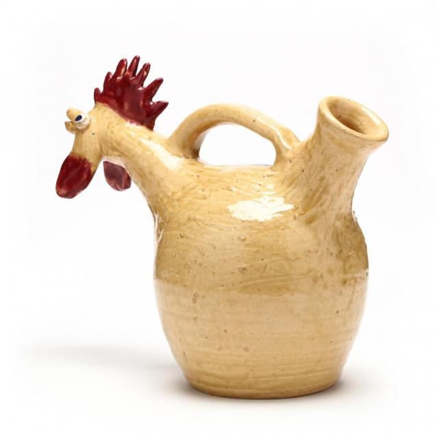 A chicken form pitcher, molded and turned with large open spout at the tail and small opening at the mouth, signed on the bottom in script and dated 9-99.