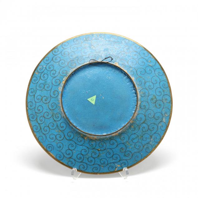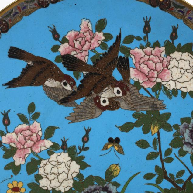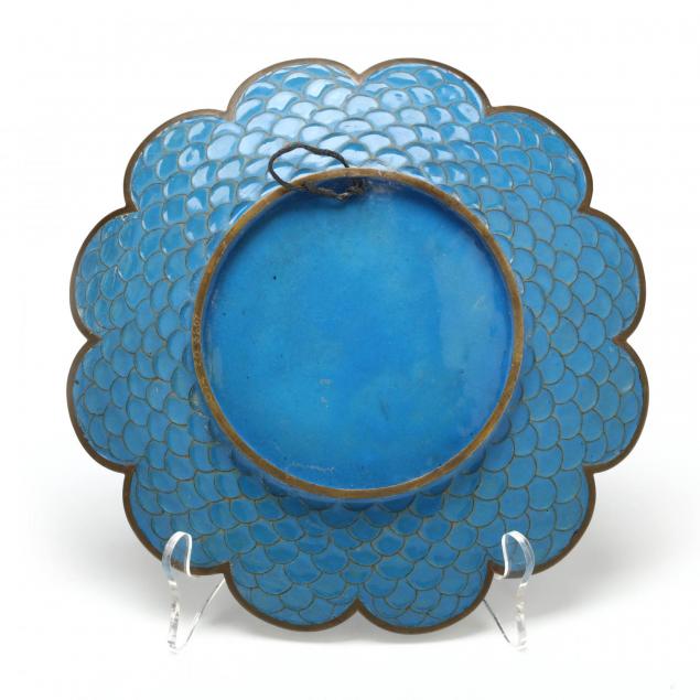19th century, largest plate decorated with birds flying amid a garden of peonies with butterflies (Diameter: 12 in., good condition with some loss and wear to enamels, especially around the rim design and on birds), smaller plate with lobed edges and a central design of pink peony blossoms, medallions surrounding the center alternate with phoenixes and irises, back of the plate decorated with blue enamel ground and raised wire in fish scale pattern (Diameter: 9.75 in., some loss and wear to the enamels especially by the edges of the plate, some pitting on plate.)
