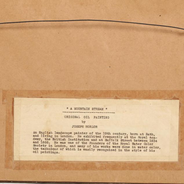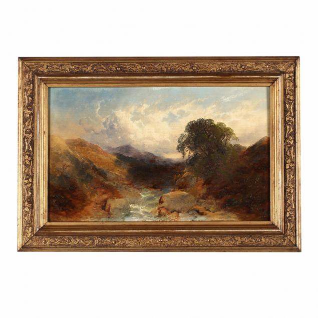 Each an oil on board; the painting depicting a mountain stream is signed and dated 1883 at lower left; the other painting depicting ships off the coast of Cornwall near Boscastle is unsigned; both with typed gallery labels on the verso and presented in matching gilt composition frames.