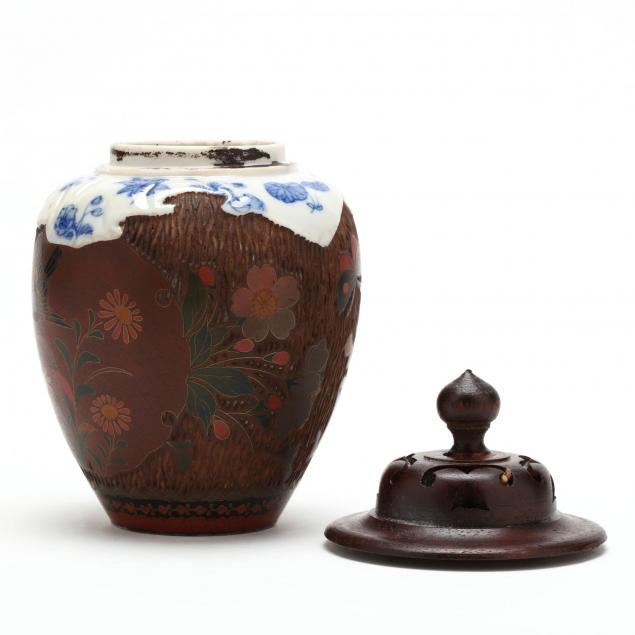 Meiji period (1868-1912), jiki-shippo plate (Diameter: 11 in., some loss of cloisonne bark to area around flowers near the center of the plate; repaired area to the rim), small jiki-shippo covered jar with exposed blue and white porcelain around upper body, later wooden lid (H: 7 in., Good estate condition, some slight rim chips to interior).