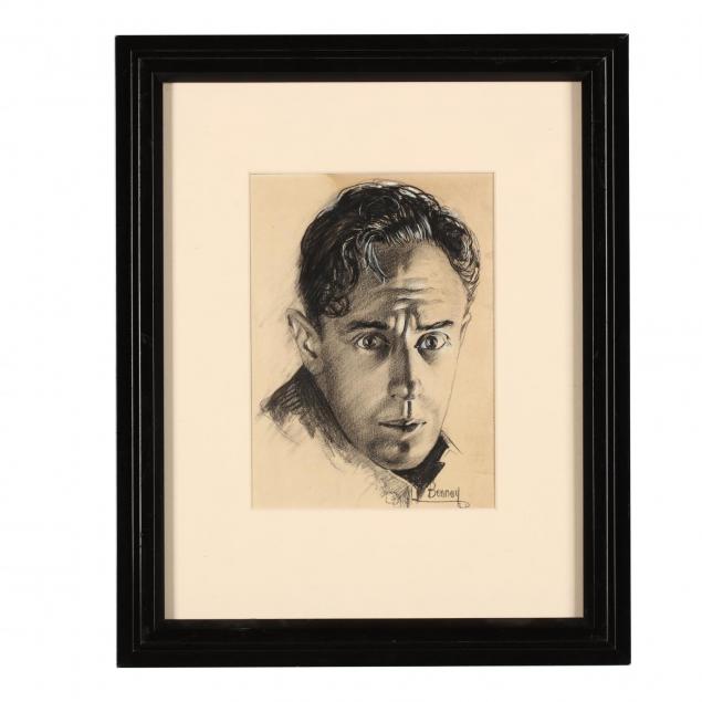 The first: profile portrait print of an 18th-century gentleman; the second: Robert L. Benney (Am., 1904-2001), Portrait of Leslie Howard, charcoal and white chalk on paper; both matted and framed.