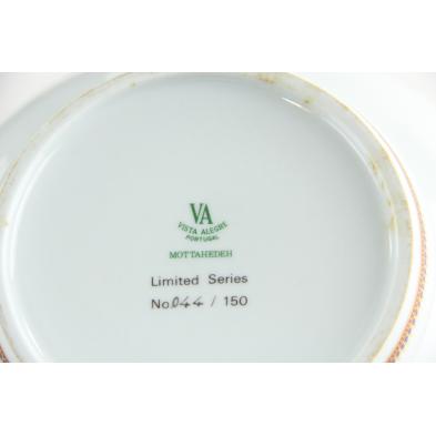 In the 18th century Chinese export style, the exterior with two large pictorial medallions featuring hunting scenes, alternating with two smaller medallions of pictorial scenes of country manors, ornate border decoration in blues, reds and with gilt highlights, marked "From a Limited Series, No. 144/150," sold with hardwood stand.