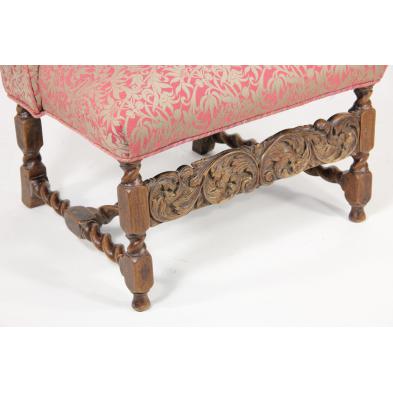 Attractive slim form, with straight sides, carved front panel below seat rail, barley twist legs and stretcher base.
