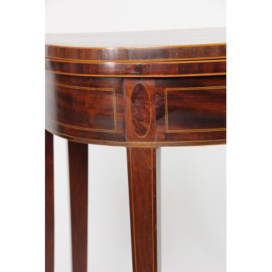 19th century, mahogany, mahogany veneers, string inlays to apron, top and legs; gate leg construction.