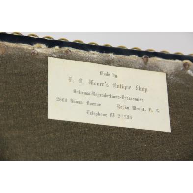 Deep blue leather upholstered seat, back and arms, allover brass tack detail, four cabriole legs, the front legs with ball and claw feet, retaining paper label.