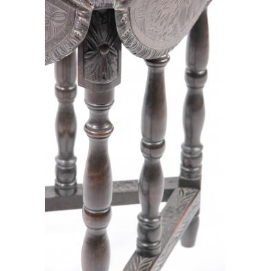 English, "House Furniture, London" label to underside, oak, triangular form, with three drop-leaves, turned legs, relief carving throughout.