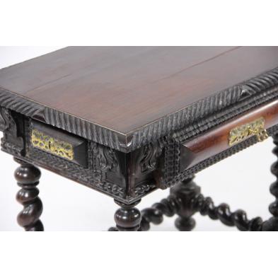 19th century, rosewood veneered to with gadrooned edge, single drawer with shaped ribbon molding, barley twist legs and stretchers.
