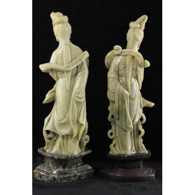 Each carved with round fan and ornate coiffures, each with integral stone base.