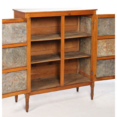 Mid 19th century, southern yellow pine, two hinged doors with three tins each repeating motif on three tins to each side, shelved interior, raised on nicely turned legs.