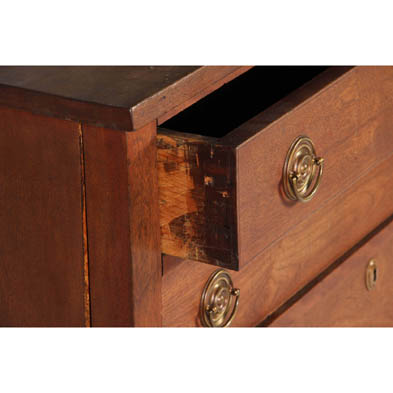 Early 19th century, mahogany, white pine secondary, four drawers with scratch bead, raised on tall turned legs.