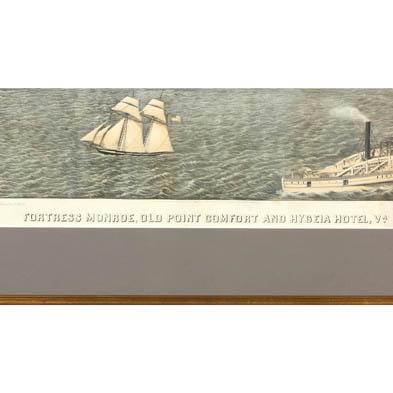 And Hygeia Hotel, Va." (New York: Charles Magnus, 1861) colored lithograph, a birds eye view of the Union's strategic foothold in Tidewater Virginia at the war's onset. Behind mat in 20th century painted wooden frame. SS 20 x 29.5 in.; DOA 28.75 x 38 in.