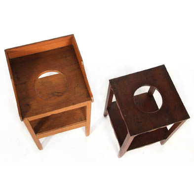 19th century, both likely Virginia, the first southern yellow pine, dovetailed applied back splash, lower shelf, square straight legs (35 x 18.5 x 18.5 in.); the second walnut having a scalloped skirt and a lower shelf, straight square tapered leg (27 x 17 x 17 in.).