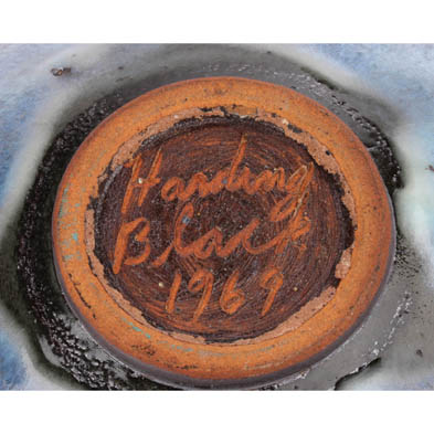 Studio art pottery, of similar decoration with resist glazes magenta and aqua blue, all bowls are footed, with scratch signature to the bottom and date of either 1969 or 1972; (largest 3.5 x 13.5 in.; 4 x 10.25 in.; and 2.5 x 8.5 in.)