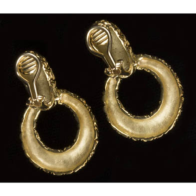The first designed in the "door knocker" motif in textured yellow gold stamped 14KT and with a maker's mark and with clip backs (1 5/16 in.); the second set to the center with an oval turquoise cabochon (11.30 x 8.80mm) in a raised prong setting and framed by (12) bead set round turquoise (2.50mm), with clip backs and stamped 14KT and with a maker's mark (.75 in.).