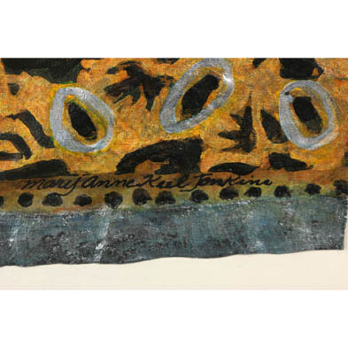 Collage on bark paper, signed at lower right, inscribed by the artist on the verso and dated 1977, mounted and framed under glass.