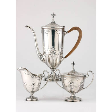 By Whiting Mfg. Co., pattern number 7062. The three piece set including a demitasse pot (, sugar bowl with cover, and creamer. Each with hand-chased and repousse hibiscus motif. No monograms.