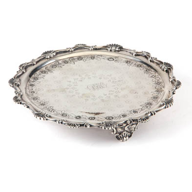 Baltimore, circa 1828-1846, with scroll and shell border, chased floral garland and engraved grapevine decoration to well, period bright cut monogram to center "RFH," marked to bottom "SamL Kirk S.K. 11oz."