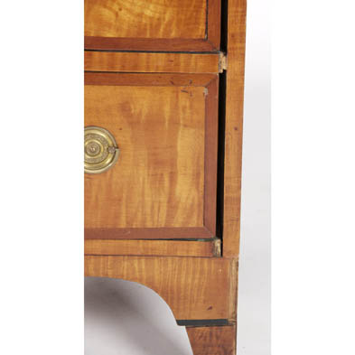 New England, early 19th century, solid figured maple with mahogany inlaid banding, white pine secondary, cased sides are cherry, four graduated drawers, scalloped skirt, straight bracket foot.