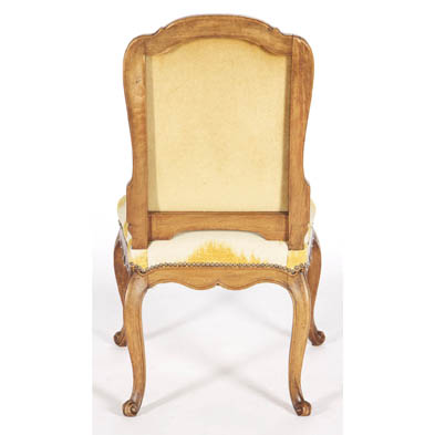 Circa 1900, fruitwood, scalloped seat rails, shaped crest, cabriole leg with whirl foot, flame stitch upholstery with brass tack trim.