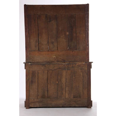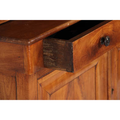 Circa 1830s, cherry with fruitwood veneers, two-part form with a removable ogee cornice above a "mirrored" veneered frieze over two blind paneled doors; the base has two side-by-side drawers over two blind paneled doors, molded flush base. With (2) keys. Fine veneers; pegged construction.