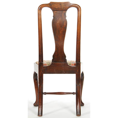 18th century, walnut, Queen Anne influence with shaped vasiform back splat, flame stitched upholstered slip seats, cabriole pad foot, rear stretcher.