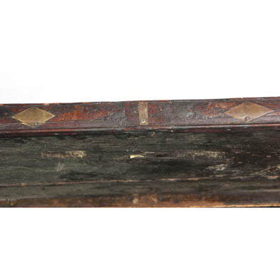 Both 19th century, the largest a carved geometric and foliate exotic hardwood case, applied decorative brass punched mounts (dark staining to top, replaced hinges, till missing lid; 20.5 x 44 x 21 in.); the smaller a relief carved exotic hardwood case with decorated pierced brass mounts (staining to top, one loose lock; 15 x 37.5 x 17 in.).