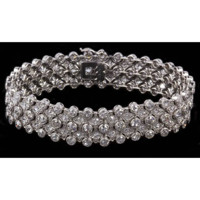 The flexible and open work platinum bracelet with (105) bezel set Old European and Swiss cut diamonds in a three row pattern (center diamond measuring approximately 2.8mm and side diamonds 2.6mm) (G-K color, VS1-I1 clarity) and alternating with (70) bead set Old European, Swiss, and single cut diamonds (measuring approximately 2.2mm) (G-K color, VS2-I1 clarity) terminating in an integrated box clasp with figure eight safety clasp, with French assay mark and numbered 140. Total diamond weight approximately 10.95 carats.