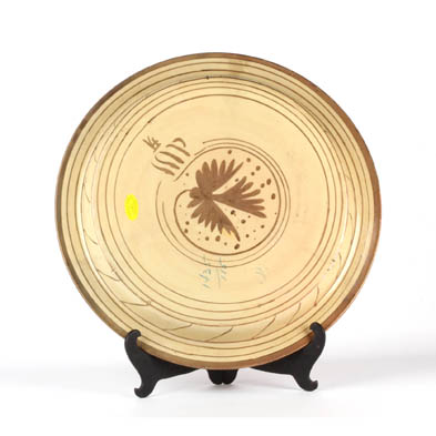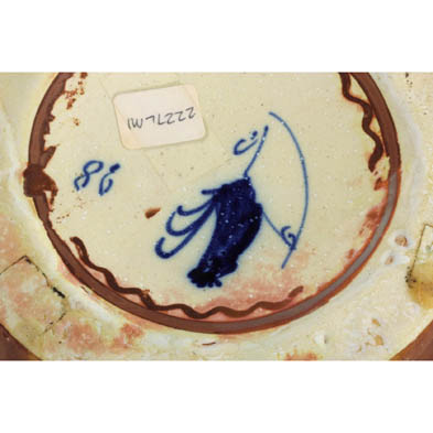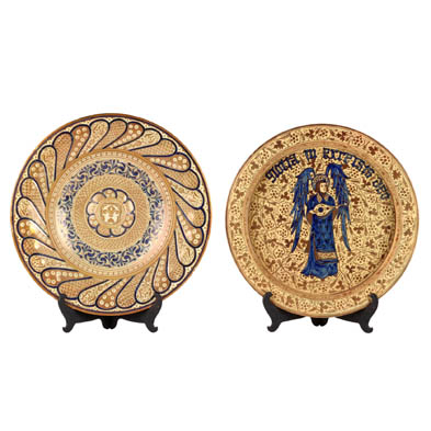The first by Cantagalli with the cockerel mark on the verso, copper lustreware with cobalt highlights, the center with raised boss featuring an armorial shield with fleur-de-lis (20 in. diameter) (several minor old rim frits); the second also with copper luster with a cobalt angel to center well, unknown mark (18.5 in. diameter) (minor rim frits).
