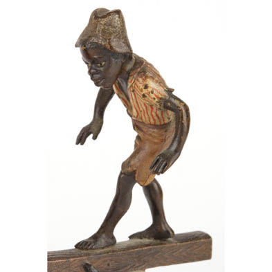 Circa 1900, likely from the Bergman Foundry in Vienna, charming group featuring three young black children climbing on a post and beam, each figure marked "Geshutzt" and numbered 1219, the stand marked 3.