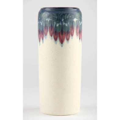 1926, No.952D, tall cylindrical form with floral border to rim, interior blue glaze and exterior cream field, with Rookwood stamp, date and artist's mark.