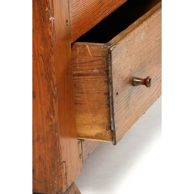 Replaced strap hinges; hinge marks evident to upper rear board but no evidence to top lid; replaced wooden pulls; drawer soles added to left drawer.