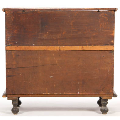 18th century, white pine, lid with applied molded edge and snipe hinges, two upper faux drawers over two long drawers, drawer stiles with applied painted half round trim, base with applied flared molded edge, raised on four bulbous turned feet.