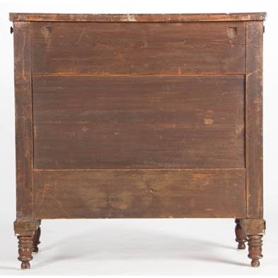 Circa 1840, mid- Atlantic, mahogany veneers, white pine secondary, rare form with two upper side drawers, the front with two upper side-by-side drawers over three long drawers, flanked by applied half columns with reeding and twists, raised on turned feet.