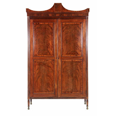 Mahogany and mahogany veneers, poplar and white pine secondary, applied inlaid pediment cornice over a veneered frieze, two hinged doors, each with double panel featuring a high quality figured mahogany veneer with cross-banded border, the doorframe with interior molded edge, the stop fluted styles, surmounted with carved rosettes, the whole raised on reeded tapered feet with brass ball caps. The interior features five sliding shelves and five drawers.