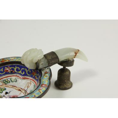 The lobed bowls each decorated with an enameled figural landscape, the cup with yellow border features a finely carved Qianlong belt hook handle of white jade (the jade with dark brownish-green mottling to one side and in very good condition) (belt hook: 3 5/8 in. long; HOA: 2 1/8 x 3 3/8 in.) (bowl in very good condition); second cup with carved jade belt hook as handle (with repaired break) (cup with some enamel loss) (DOA: 2.25 x 3.5 in.; Handle: 3.25 in. long).