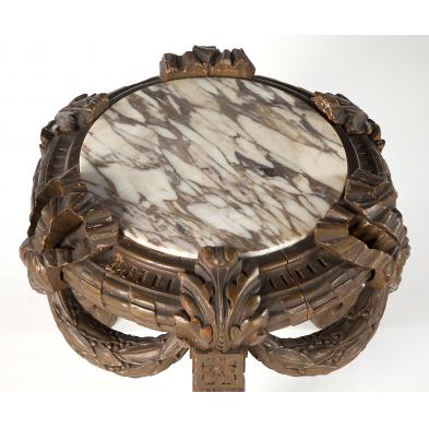 Late 19th century, inset marble top within carved and gilt wood raised acanthus leaf and ribbon border, supported on three carved legs with paw feet, each leg connected by double swags.