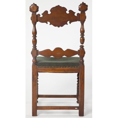 Early 20th century, walnut turned frame, stretchers, button decorations on seat rail, shaped slat back, scroll, crest and rosette pattern, shell shaped finials.