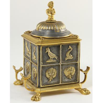 19th century, gilt bronze mounts, the square body decorated in quadrants featuring flowers, birds and dolphins in relief on a steel background, the domed and hinged cover with figural finial, double pen rests on either side of body, all raised on four finely cast paw feet, with glass liner; the cover signed "E. F. Caldwell & Co., of NY."
