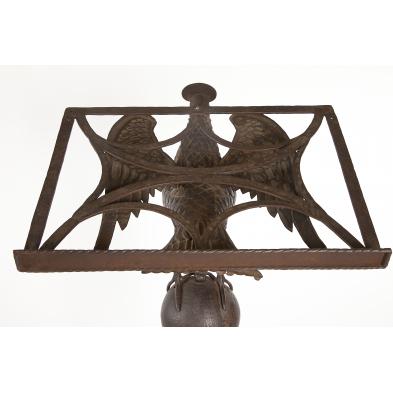 18th century, hand hammered liturgical pierced tray resting atop the spread wings of a full bodied eagle perched upon a sphere, supported by a spiral twist standard on arched tripod base, the base with applied stylized serpents.